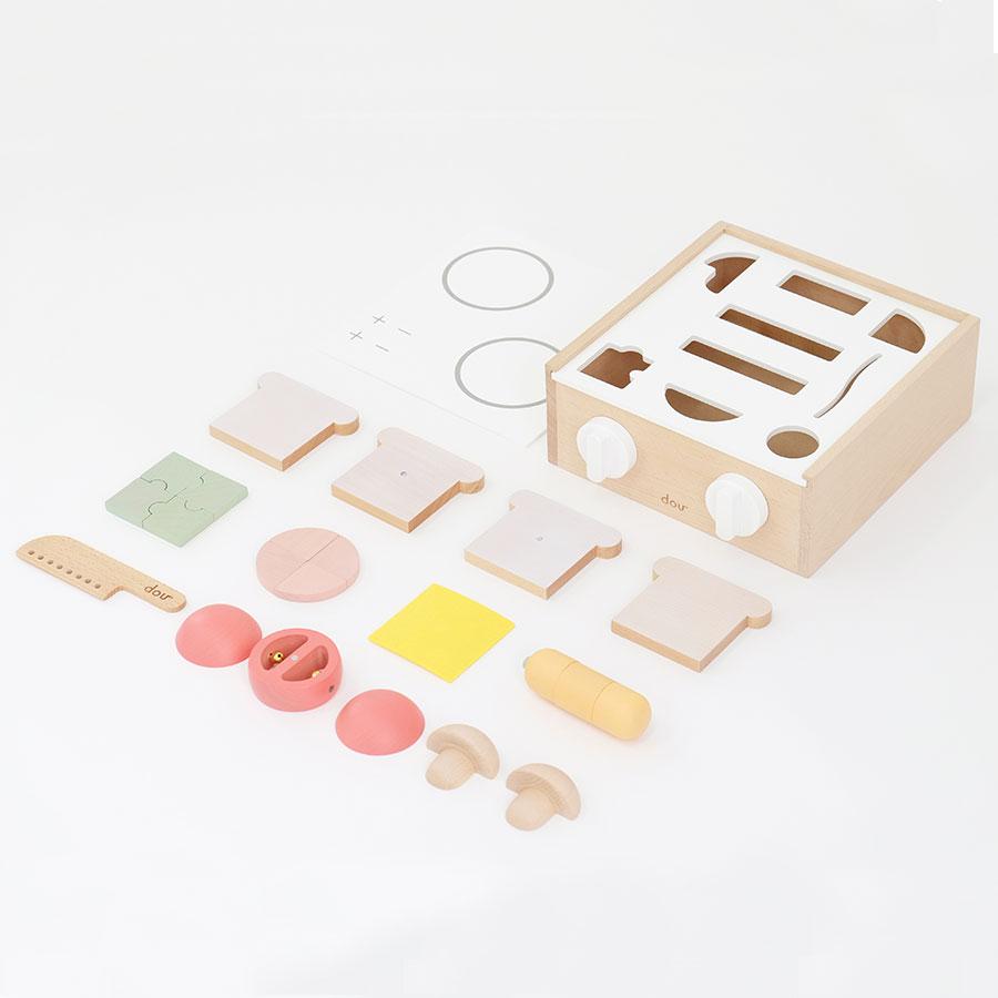 トマトは鈴に、レタスはパズルに、さらにコンロプレートを外すと型はめのプレートがあらわれる楽しい工夫が施されています。食材を切ったり、くっつけたり、形をよく考えて穴に入れたり…遊びながら図形感覚を育て、創造性を高めれる型はめ遊びも楽しむことができるおもちゃです