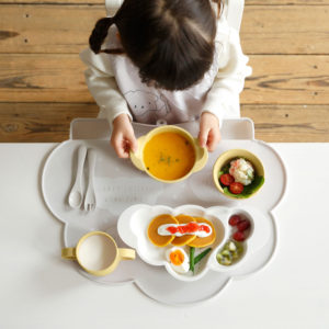 マママンマのプレートの「もくもく」とした雲形は、ご飯をすくいやすくなっているのですが…本当にすくいやすい。ペースト状のご飯もキャッチしやすく、スプーンやフォークに慣れていないお子さんでも使いやすくなっている設計されています。