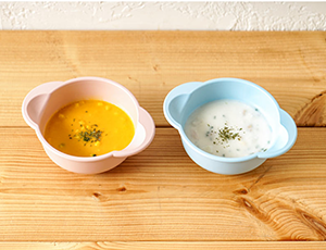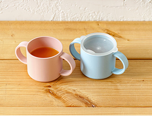 両手で持ちやすいようにみみ付き。スープなど自分で飲めるように練習することができ、自分でどんどん飲もうとしてくれるんです!気になる方はストッパーもつけることが可能だそう。