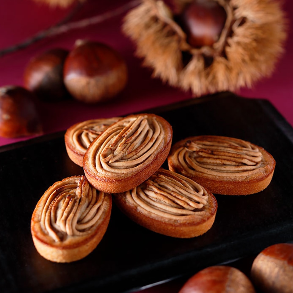 生地にも表面に絞ったマロンクリームにも栗の風味がしっかり感じられるマロンペースト、生地には白あんを使用し、ほくほくの甘い栗を食べているような贅沢なスイーツ。