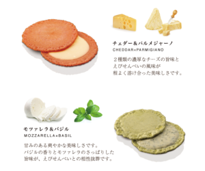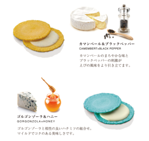 このチーズたちを掛け合わせたチーズソース4種類を挟んだえびせんべいとなっています。