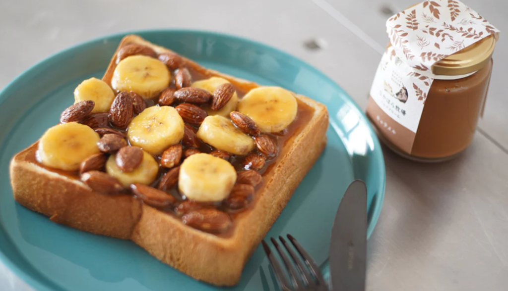 ナッツやバナナをあわせパンにのせたキャラメルナッツトーストは最高